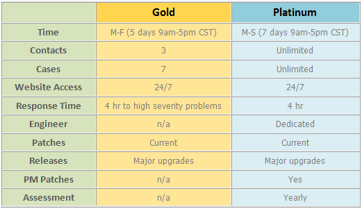 Getting Entera technical support with eCube Systems is very easy. Just contact our customer support engineers. Depending on your needs, there are two main levels of support: Gold and Platinum support. Entera customers that had support contracts through Open Environment and Borland and are familiar with the Gold and Platinum support levels. For those unfamiliar with these support levels, the chart below highlights the features. An SLA for support is available on the Downloads page.