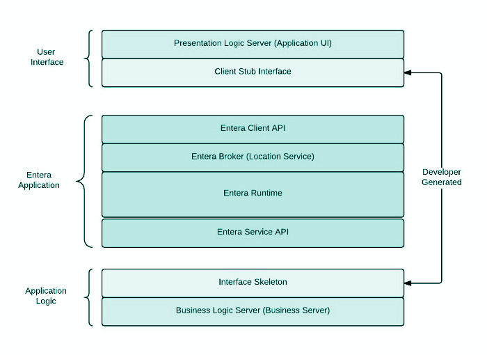 Entera includes an expanded implementation (version 2.1) of Open Environment's popular development tools formerly known as Encompass a first DCE-based three-tiered client/server development architecture. The three-tiered approach, pioneered by Open Environment in 1991, lets developers build and change applications easily and rapidly by separating them into three components: the user interface (client), application logic (server) and data access technology. This architecture offers a practical way to make application code portable, flexible and reusable.