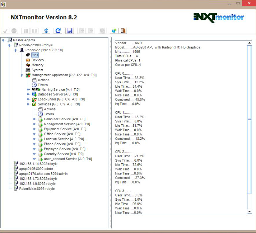 NXTmonitor provides a GUI based tool that enables agile applications to be deployed by Operations by handling the configuration dependent changes between Development and Operations. NXTmonitor, a DevOps tool, enables the capture and export of portable configuration file for the deployment and automated execution of distributed applications on the Grid or in the Cloud. Whenever you deploy new versions of applications into your production environment, you need to make sure your applications operate and perform properly so users can use the new features. Most importantly, you need to able to monitor and manage these applications remotely. To effectively manage distributed applications, you need to have a real-time management console to monitor these applications on each platform. In addition, you need the ability to start and stop these applications automatically, provide a mechanism to replicate services and scale them up during peak load times. NXTmonitor provides this console interface and simplifies the process for operations staff with easy to recognize indicators for application status. A maintenance interface is also provided for maintenance activities and development of configurations.