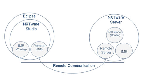 The server component that executes commands initiated in NXTware Remote Studio is called NXTware Remote Server. It is responsible for receiving the source code from NXTware Remote Studio and converting requests from the Eclipse plug-in into actions on the remote server.